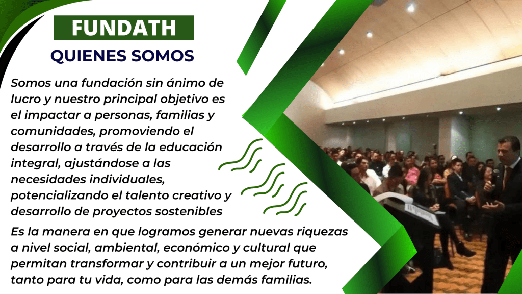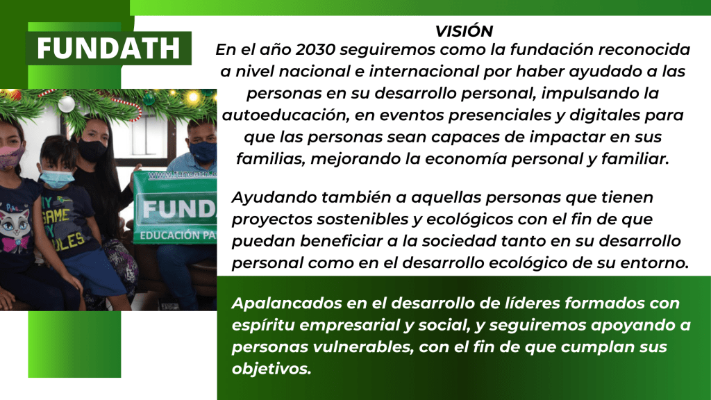 FUNDATH, es una fundación creada a partir de personas que hacían y siguen haciendo las cosas mencionadas anteriormente, pero decidieron crear la fundación porque entendieron que, aunque con sus propios recursos no podían ayudar a miles de familias, si podían lograrlo con la ayuda de cientos de personas que también están dispuestas a cambiar la vida de los demás y de ellos mismos (si, por ayudar también tendrás beneficios, pero eso lo verás en el apartado de donaciones) mientras promovemos entre todos valores que verdaderamente generan impacto en la sociedad como lo es la humanidad, solidaridad, generosidad, comprensión, amor, ser inspiración para los demás y muchos valores más que a usted y a nosotros nos representan.